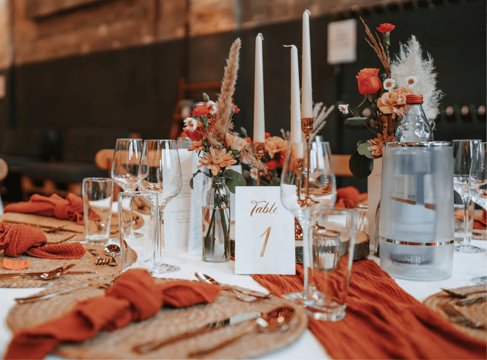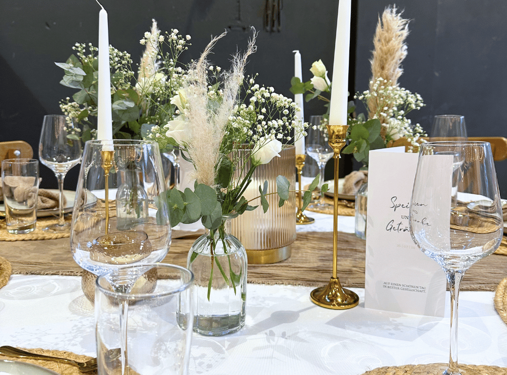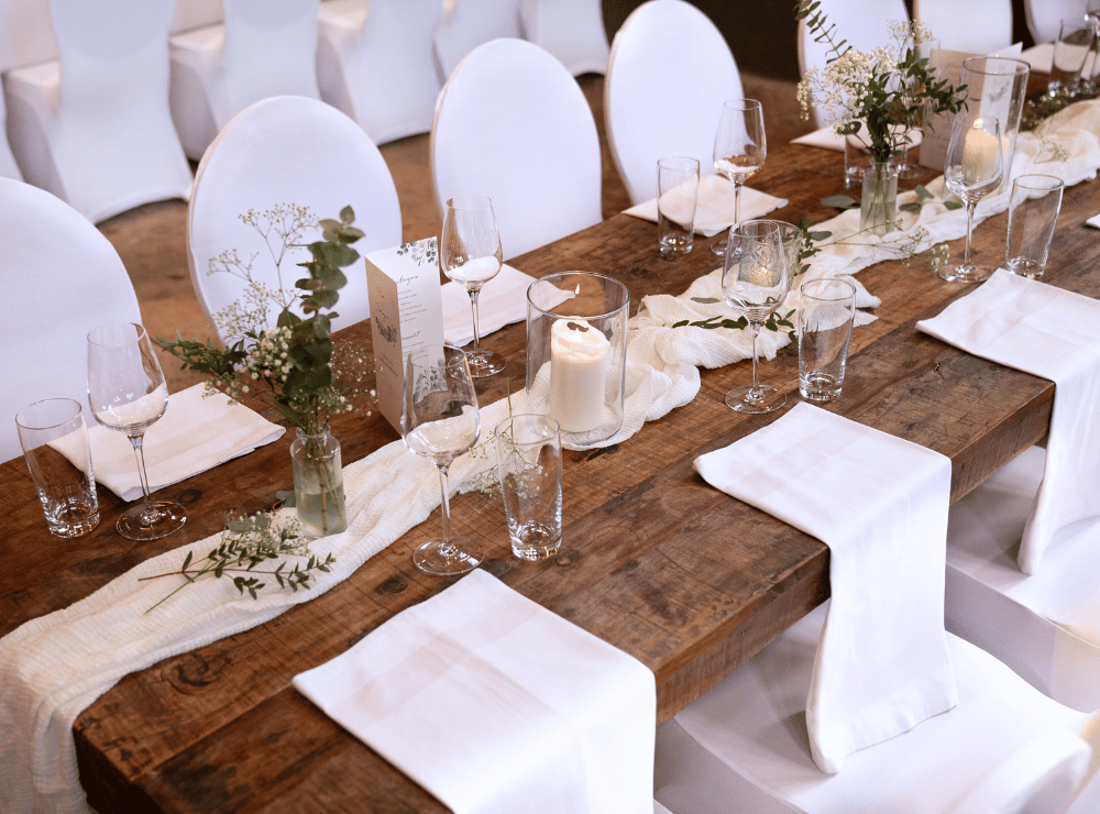 Wenn ihr euch für unsere Location entscheidet, erhaltet ihr von uns Zugang zu unserem eigenen Dekoverleih. In Form eines Dekokatalogs findet ihr hier nochmal alle Artikel aufgelistet, die im Preis inklusive sind und die Artikel, die gegen Aufpreis dazu gebucht werden können. So findet ihr dort neben anderen Tisch-Stuhl-Kombinationen auch Traubögen, Fotoboxen, Vasen, Kerzenständer, Platzsets, Servietten & vieles mehr. Aus mehr als 100 Artikeln könnt ihr wählen und eure Hochzeit ganz nach eurem Geschmack gestalten. Hier ein kleiner Einblick, was euch erwartet: