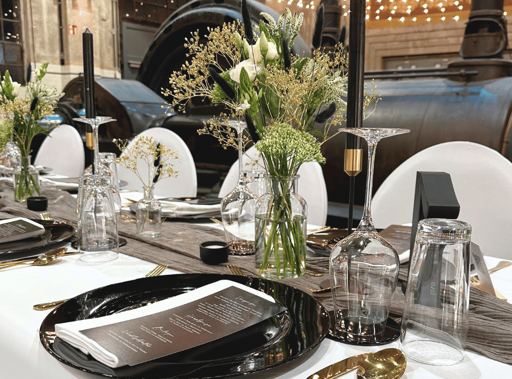 Beton- und Backsteinwände, Stahlträger, hohe Fensterfronten und großzügige Raumhöhen verleihen der Alten Maschinenhalle ihren unverwechselbaren Charakter. Unsere historische Eventlocation lässt sich flexibel gestalten – von elegant und modern bis romantisch und verspielt.